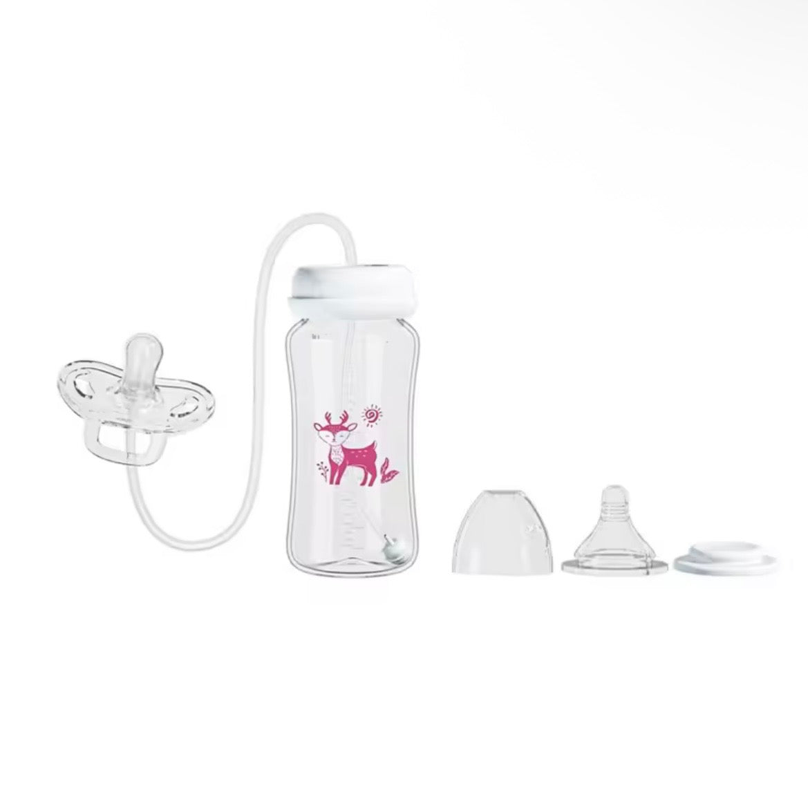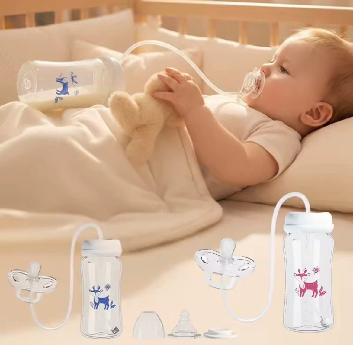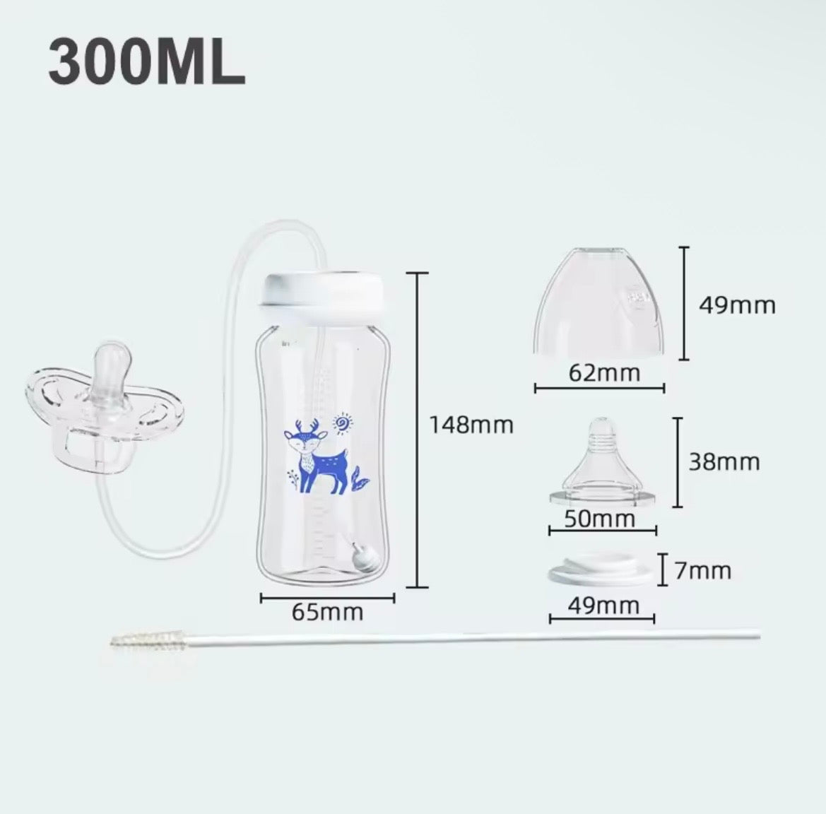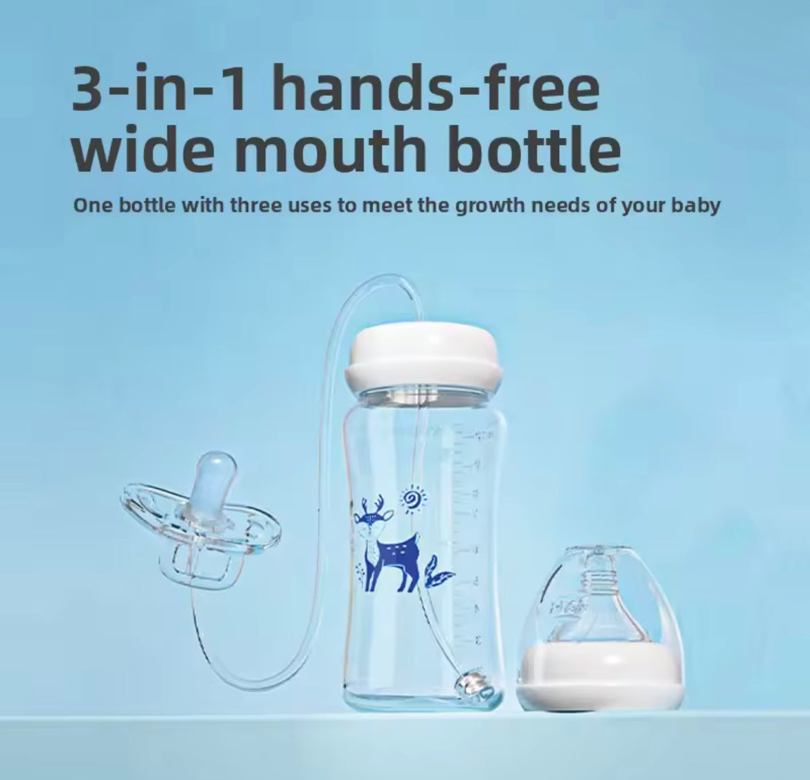 Biberon multifonction 3-en-1 mains libres à col large de 300 ml, avec compartiment de stockage de lait et tétine, et biberon anti-chute à bille gravitationnelle.